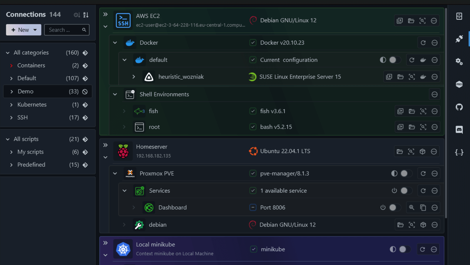- 连接中心:能轻松实现所有类型的远程连接,支持SSH、Docker、Podman、Kubernetes、Powershell等环境。