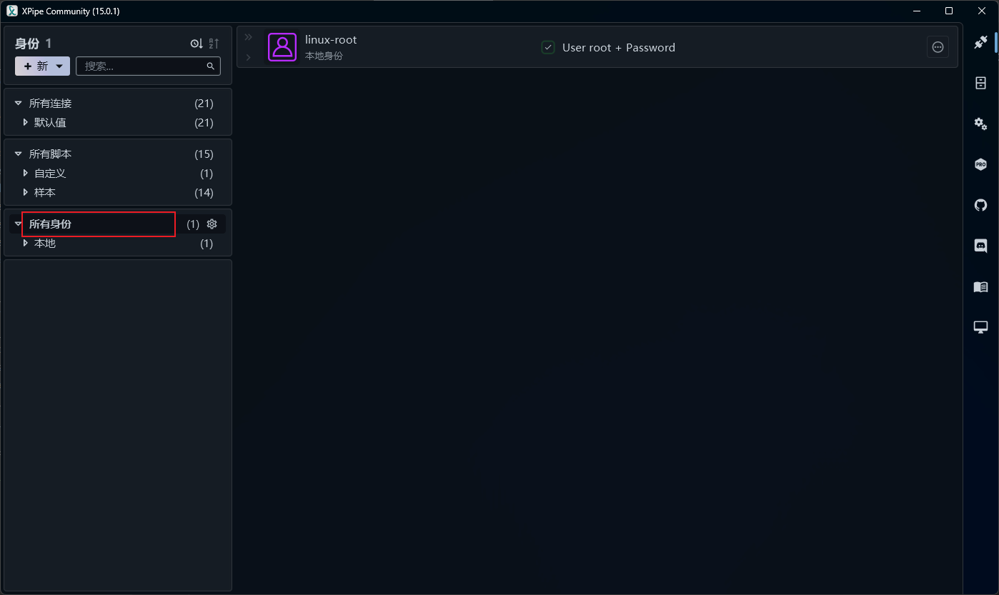 所有身份中存储着我们的账号密码,之前创建的Linux root账户在这里可以进行修改。