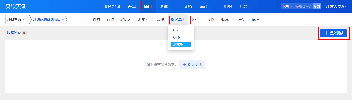 - 有了版本以后,才可以根据当前版本创建测试单: